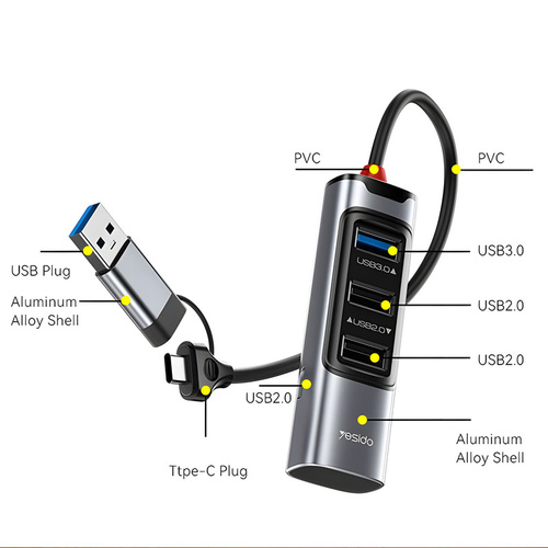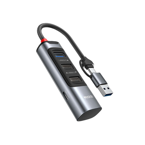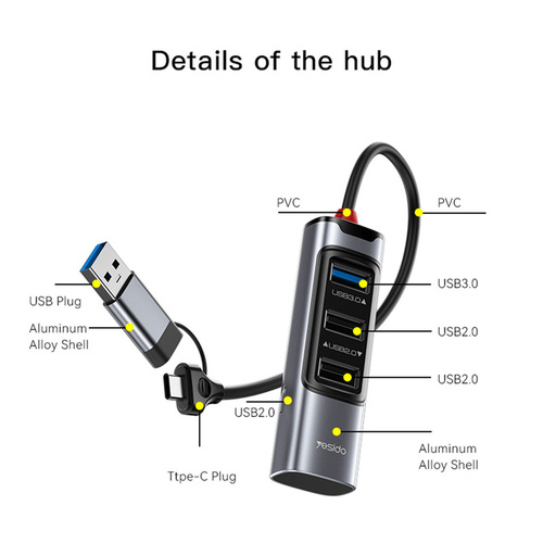 هاب 4 پورت تایپسی/USB یسیدو YESIDO HB19 محصولی از کارخانه یسیدو است. هاب با بدنه مقاوم آلمینیومی و پلاستیک PVC طراحی شده که محکم و در برابر ضربات احتمالی مقاوم است.بدنه آلمینیومی آن باعث از دست دادن گرما میشود و از داغ شدن هاب جلوگیری میکندطراحی کوچک در سایز 230x25x18 CM و وزن 30 گرم آن مناسب برای جا به جایی است.سرعت این هاب بسیار بالاست و بلافاصله بعد از اتصال آماده شروع به کار است.دارای دو کانکتور USB و تایپسی مناسب برای اتصال به کامپیوتر و گوشی و تبلت و …هاب دارای یک پورت تایپسی و دو پورت USB.2 و یک USB.3 مناسب برای اتصال به دستگاه های مختلف مثل موس و کیبورد و … با قابلیت انتقال اطلاعت با سرعت 480 mb/s با پورت USB.2 و با سرعت 5 Gb/s با پورت USB.3 است.